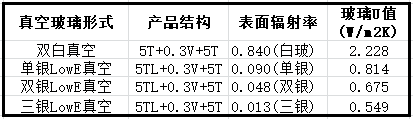 真空玻璃至少应有一片玻璃是低辐射玻璃。由于真空玻璃中心部位的传热在很大程度上通过辐射实现,所以是否使用LowE玻璃,甚至LowE玻璃表面辐射率的差异,都会对真空玻璃的隔热性能造成很大影响。见以下数据。